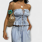 Kroj: Visoki struk, bez naramenica: Visoki kroj bez naramenica naglašava figuru i pruža moderni izgled. -