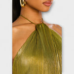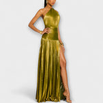 Otkrij haljinu Emma, hrabru i sjajnu kreaciju u elegantnoj metalik peridot nijansi koja redefinira moderni glamur. Njegov skulpturalni halter izrez i otvorena leđa dodaju dašak sofisticiranosti, dok suknja s visokim prorezom omogućava senzualan i lepršav pokret.