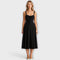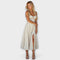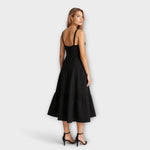 Kiana Midi haljina kombinira prilagođenu korzetnu gornji dio s lepršavom suknjom – savršena za stilizirane nastupe.