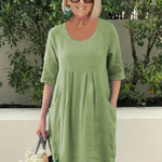 Doživite bezbrižan stil i udobnost s našom ležernom haljinom od lana s džepovima, savršenom za tople dane i ležerne izlaske. Ova haljina ima okrugli izrez i opuštenu siluetu, što je čini vašim prvim izborom za šetnje po vrtu ili brunch s prijateljima.