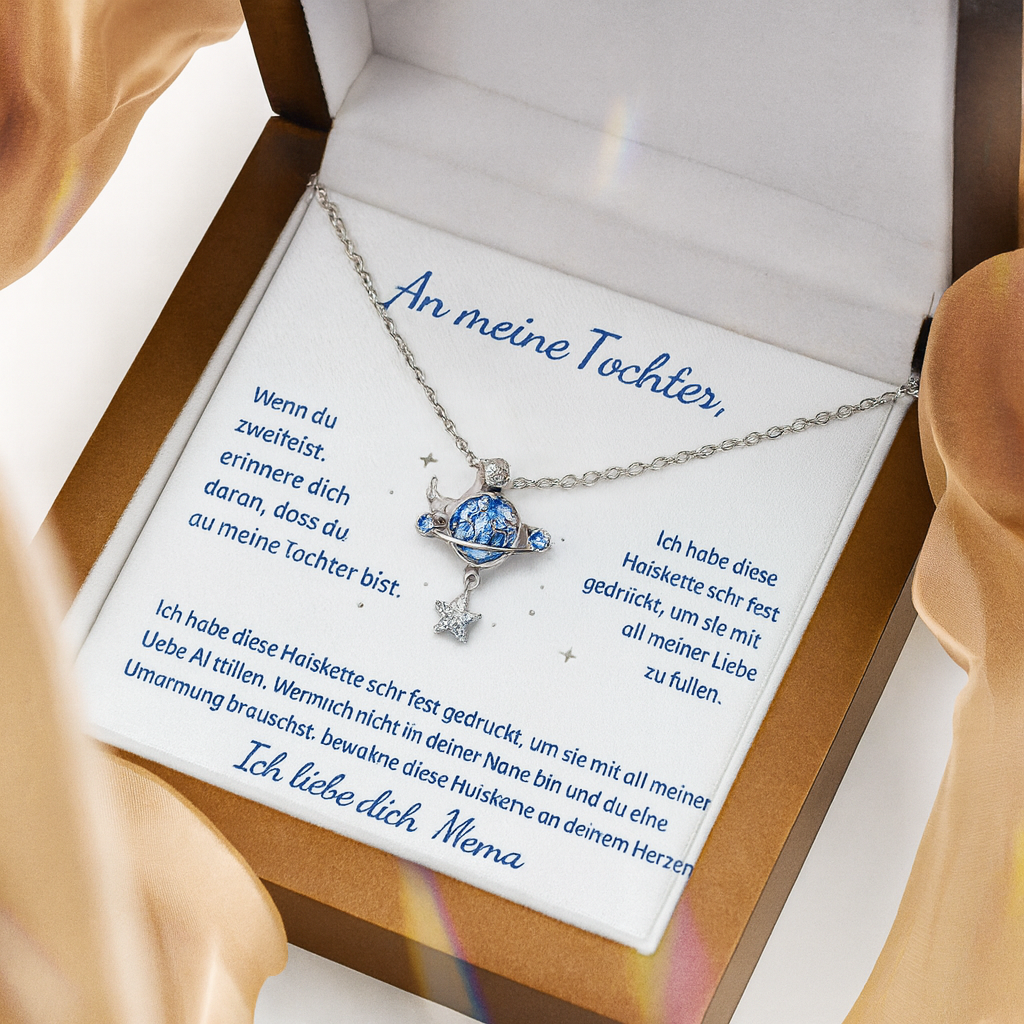 Ovu ogrlicu sam čvrsto obgrlila kako bih je napunila svom svojom ljubavlju. Drži ovu ogrlicu blizu svog srca kako bi osjetila moju ljubav. Volim te, mama